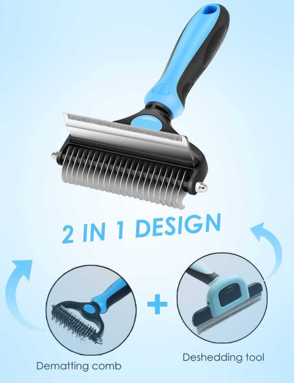 `With deshedding side, you can remove the hunks of the downing fur with a few swipes. Easy Grooming Wide dematting teeth can cut stubborn knots and mats easily. Makes your grooming safe, time faster and easier. The material is loved by your pets.Comfortable To Use A non-Slip rubber handle makes the cleaning comfortable and easy. With easy cleaning teeth you not need to put in extra effort.